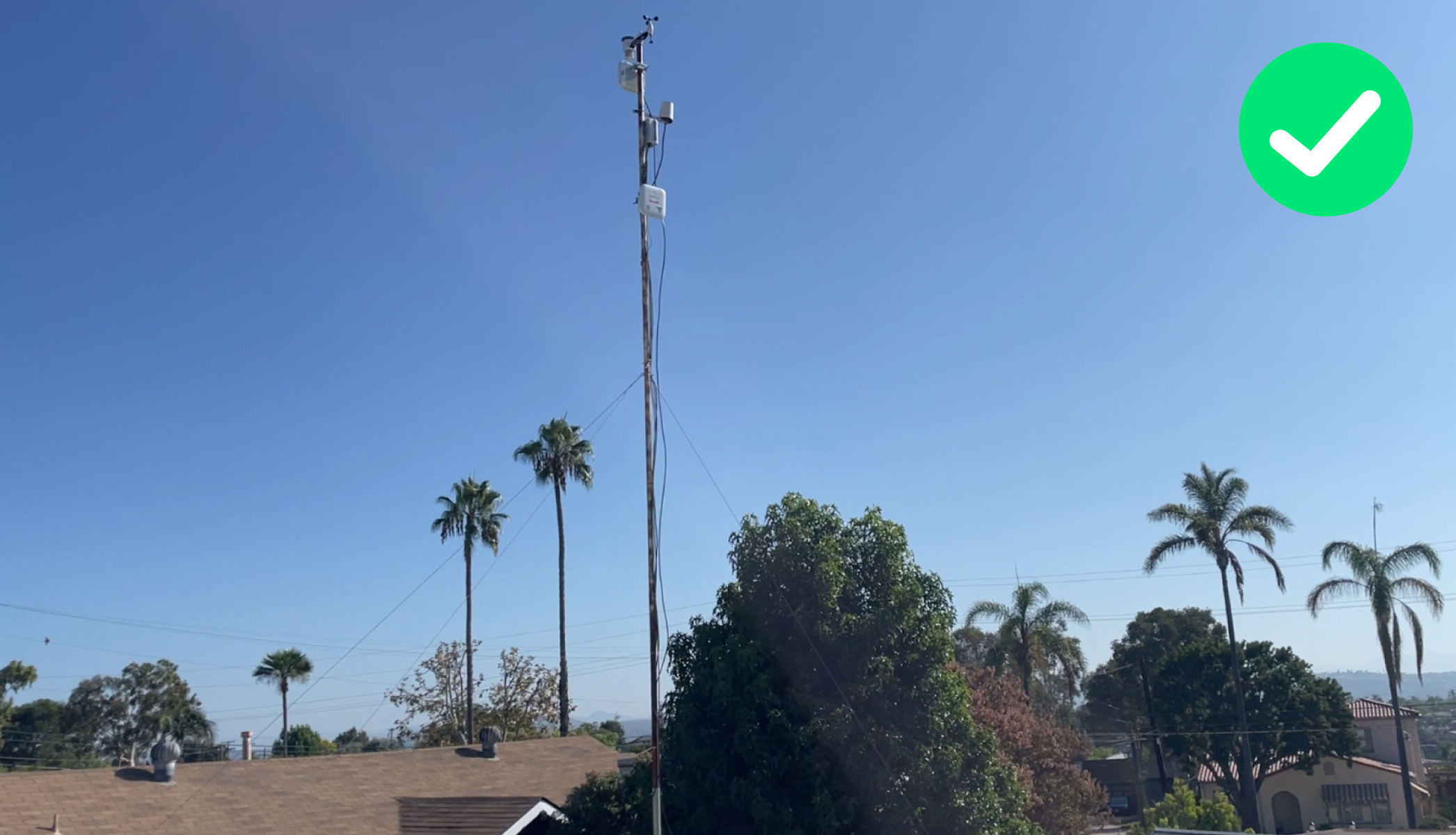 The station has been deployed at the highest point of this apartment, which is located at an area, where other obstacles are not much higher. In addition, the mast is ~7m makes the deployment quite ideal. Sparse thin coconut trees shouldn’t be able to affect measurements. In a case like that the user should tight firmly the wires that stabilise the mast. Otherwise, the mast may significantly oscillate, producing faulty wind and especially rain measurements.